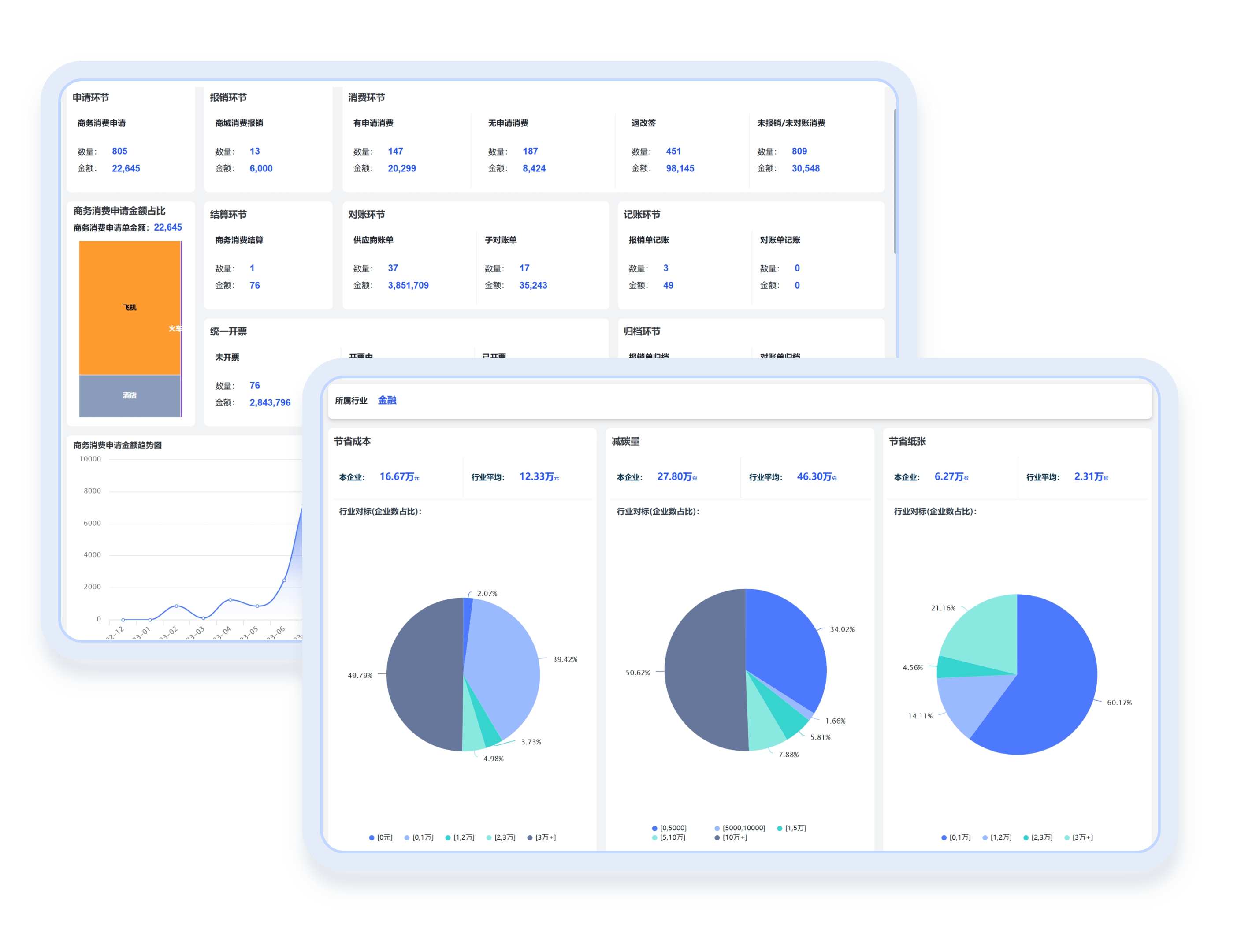从申请、消费、报销、对账、开票、归档等全链路视角,分析各环节的业务量、商务消费金额、数字化/自动化程度等;为整体掌控企业商务消费金额及分布、衡量企业数字化水平、洞察自动化改进机会等提供决策信息,助力企业进一步降本增效。