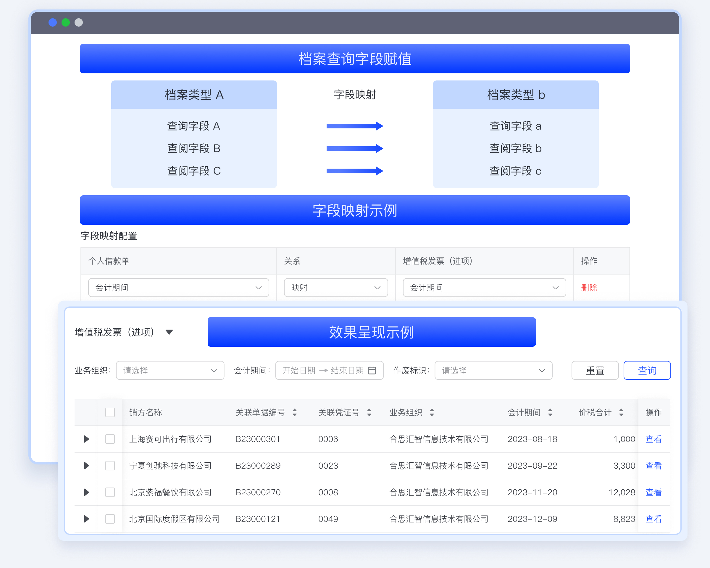 装完成的档案数据支持映射查询,原始凭证与记账凭证匹配后,记账凭证中核算组织、会计期间等字段回写原始凭证结构化数据中。