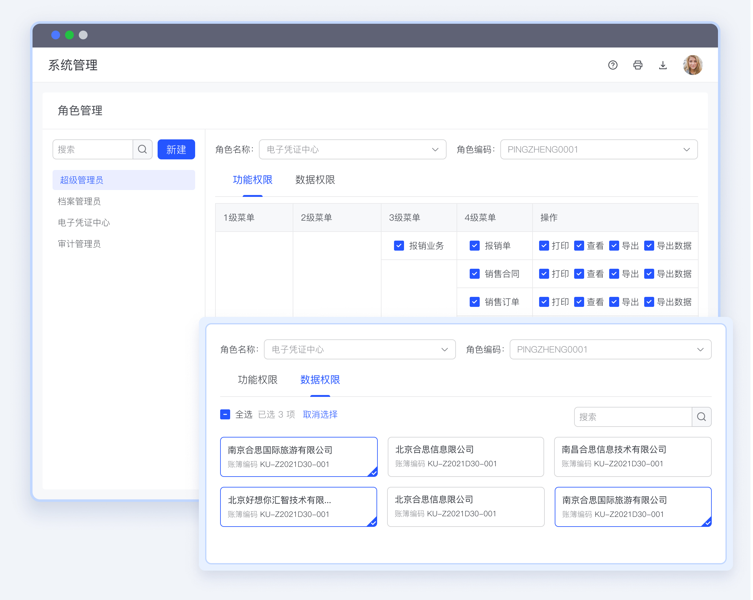 合思档案自定义创建用户管理角色,自定义隔离各核算账套数据权限,支持按照职能角色配置功能、操作权限。