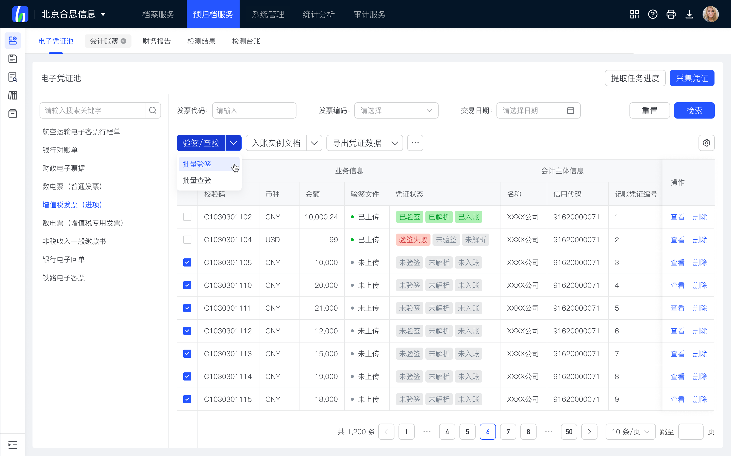 试点要求的9类电子凭证类型全范围支持。支持批量进行验签验真,生成、更新、导出入账实例文档。