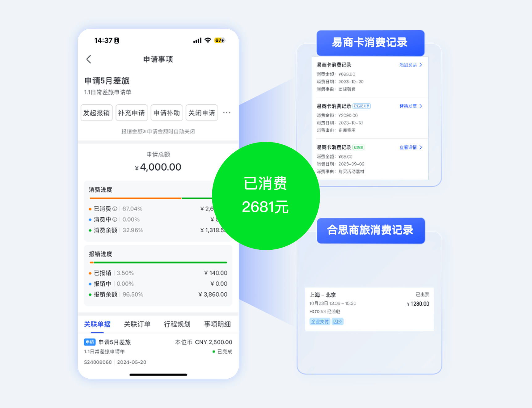 合思商旅平台一张申请单包含线上+线下全部消费信息,消费/报销进度实时展示,同时可展示消费中订单
