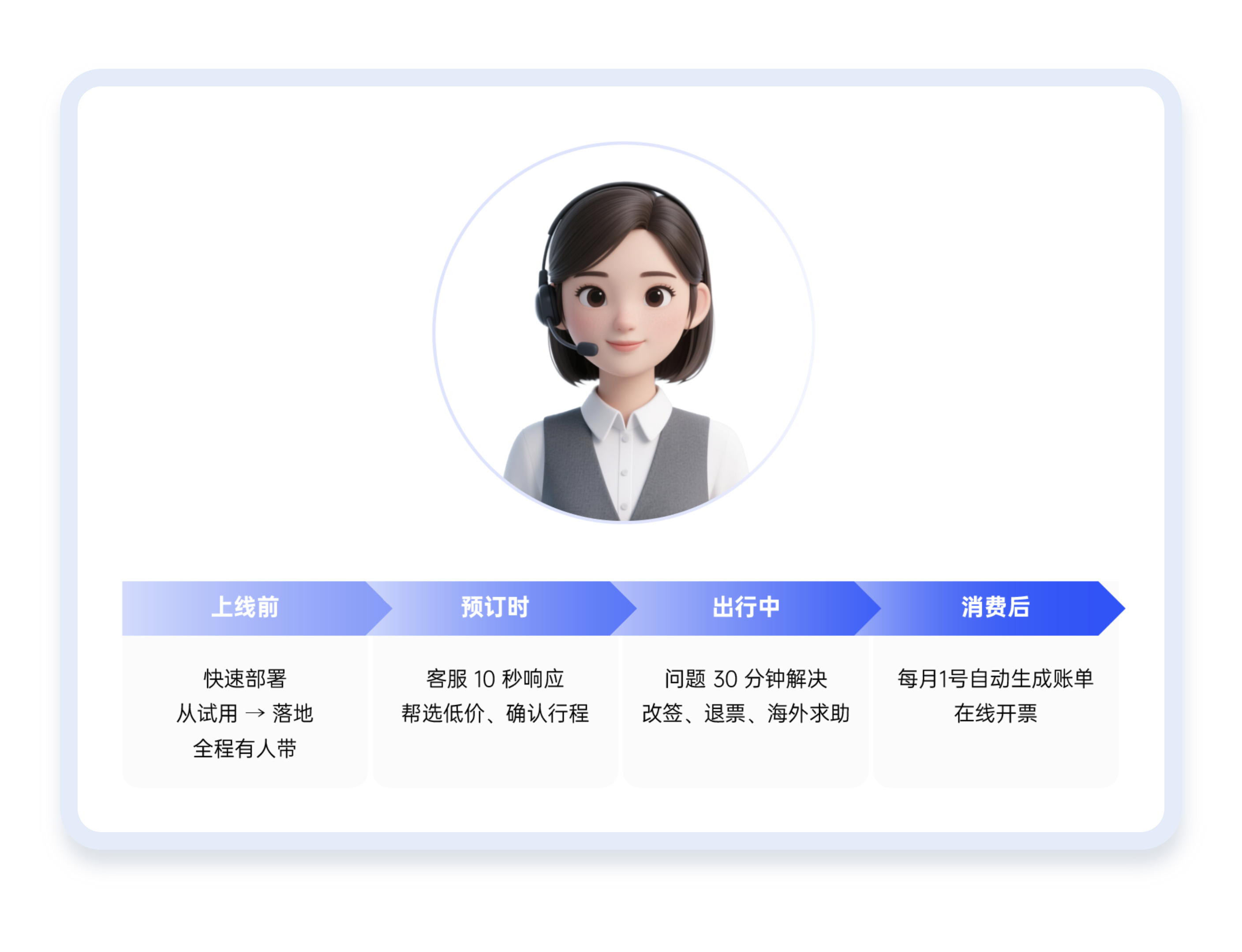 7×24 小时在线不打烊,从上线前专人带教到预订 10 秒响应,出行中 50 分钟极速解难、售后自动开单 ——100 人 + 专业客服团分层处理问题,无隐形收费、透明定价,全流程标准化覆盖,让每一次行程都稳当安心。
