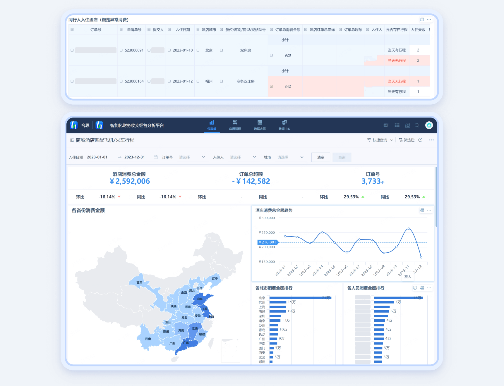 消费过程数据管控,同一平台内比价,降低差旅成本。