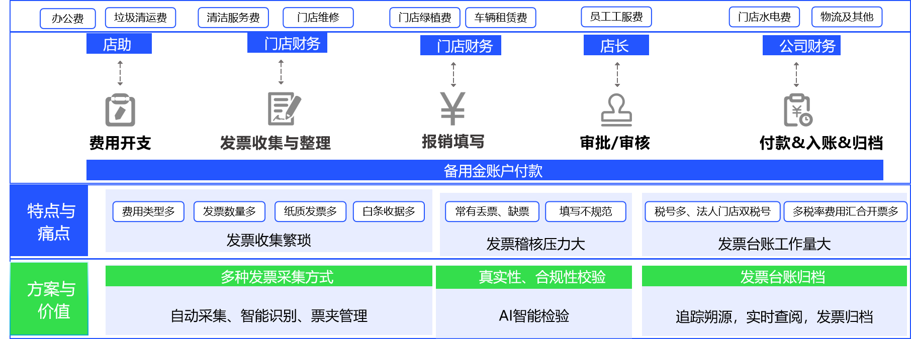 连锁餐饮店长常兼任报销人,面对百种繁杂费用,填报极易出错致退单,丢票缺票错票情况频发,耗费店长大量精力。