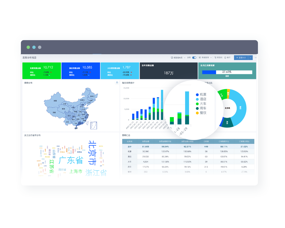 差旅效率低,业务长期出差垫资压力大,报销到账慢;财务复核记账工作多,费用需要人工归集到项目上,难以实时监控项目收支情况。