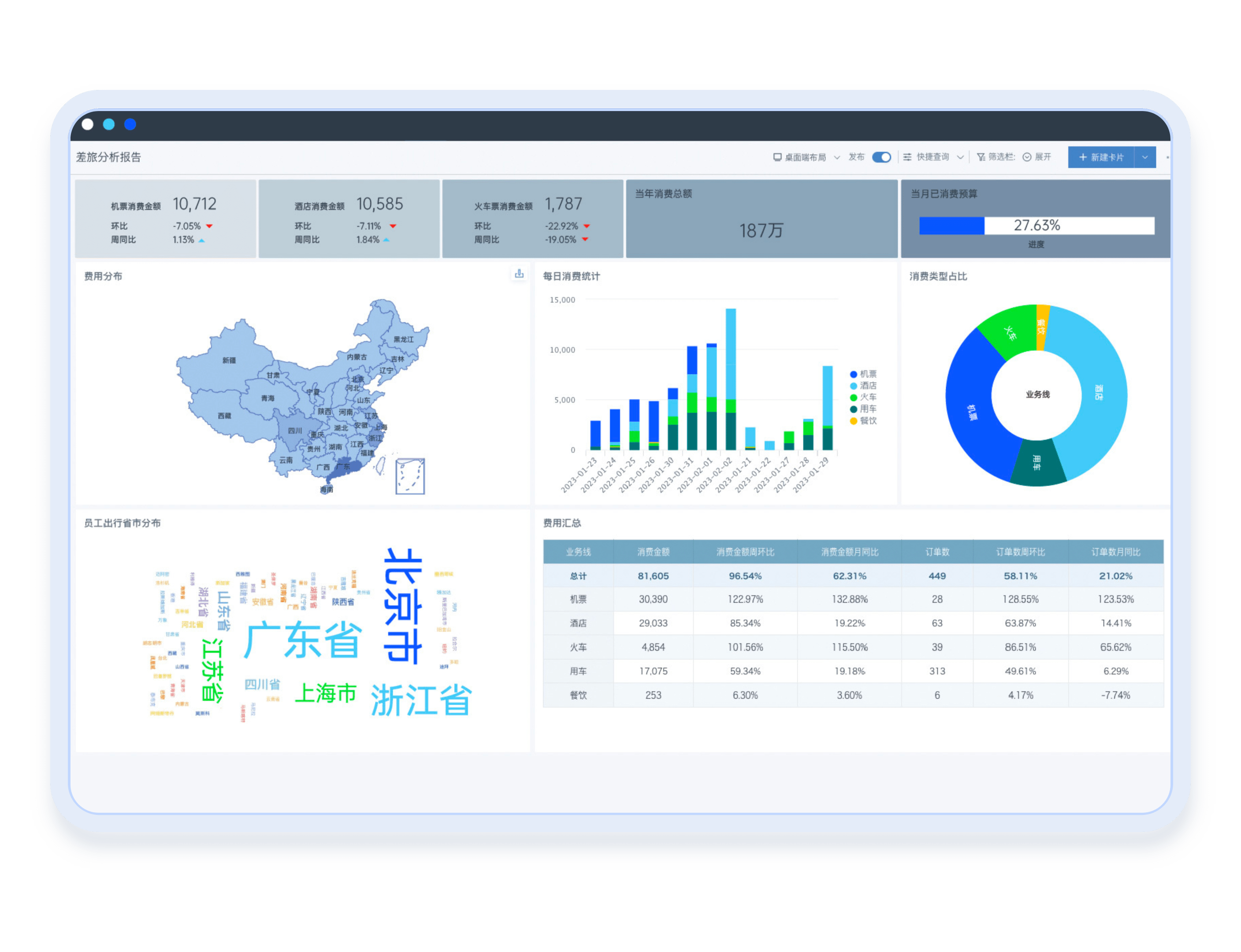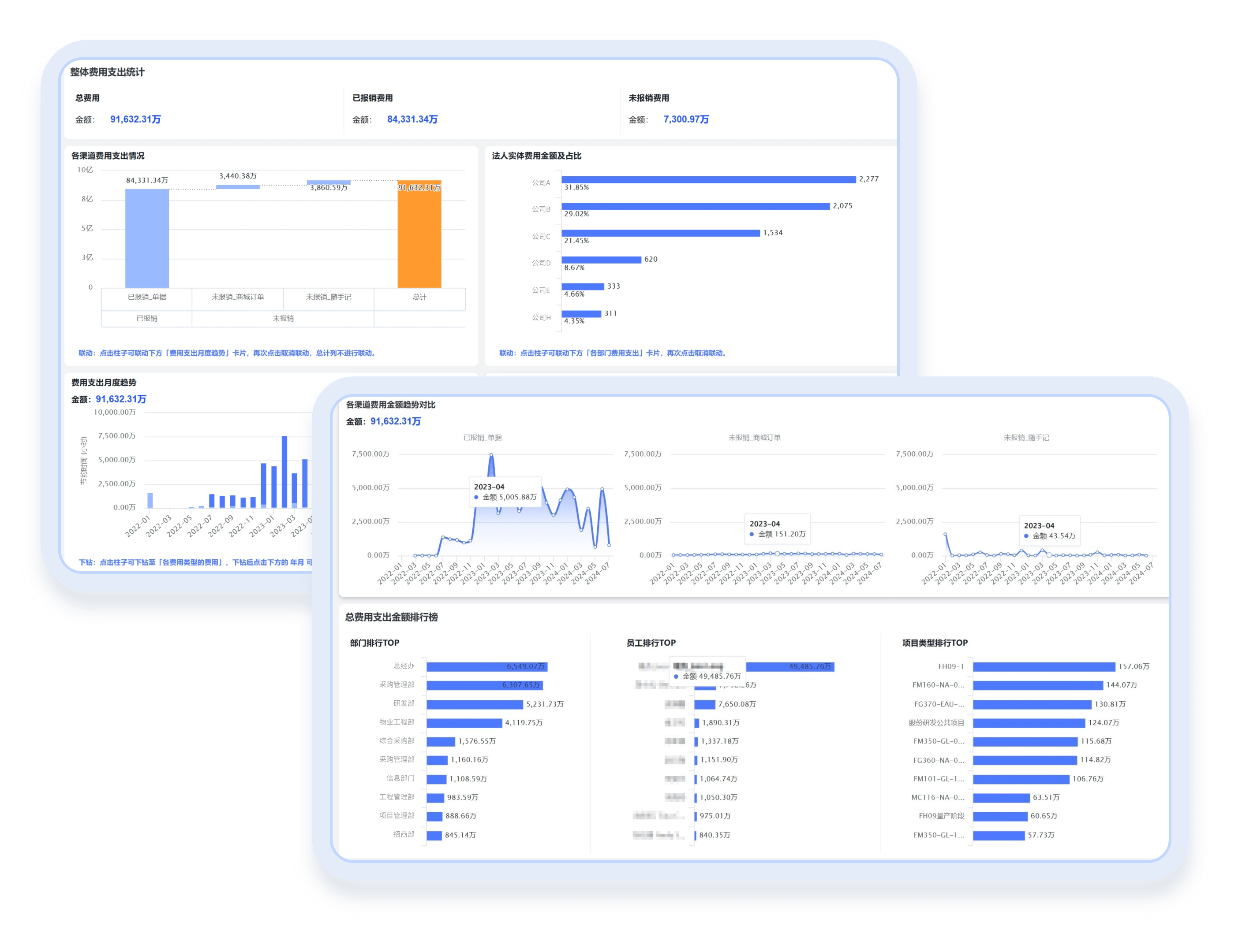 从公司整体视角,按公司、部门、费用类型、时间等多种条件统计各渠道发生的费用,包括费控单据、合思商旅、易商卡、以及跟合思集成的三方TMC/出行平台,从而让公司的费用统计分析更完整、真实、灵活。