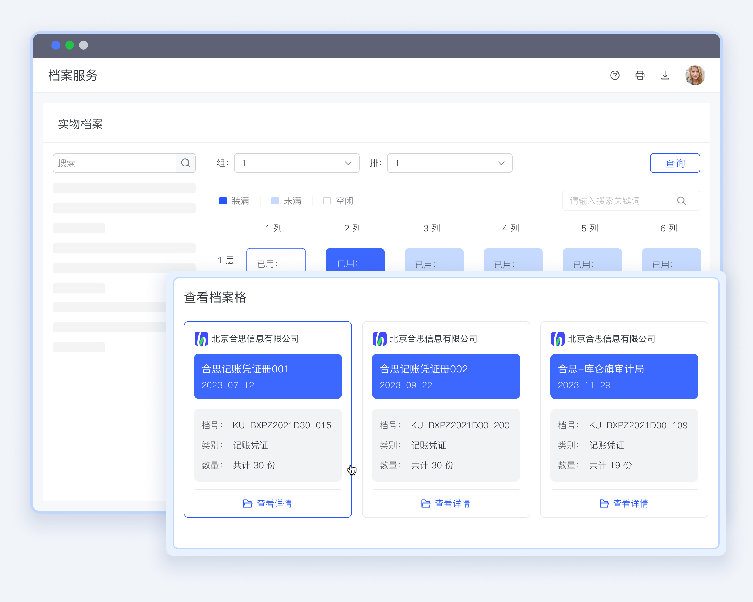 电子&实物档案高度关联,查询电子档案即可定位实物档案位置。支持实物到单确认、线下实物装盒、档案上下架管理等,便捷实物档案管理。