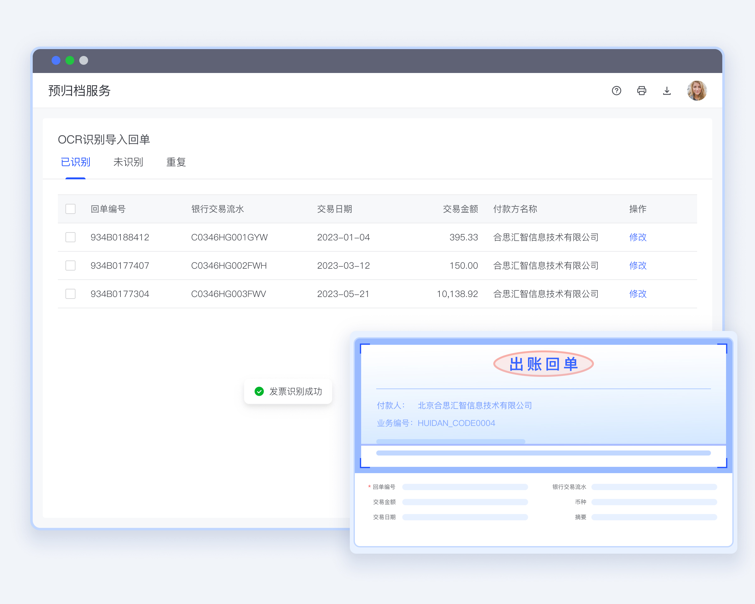发票、回单影像PDF大文件OCR自动识别,多张自动切割。
