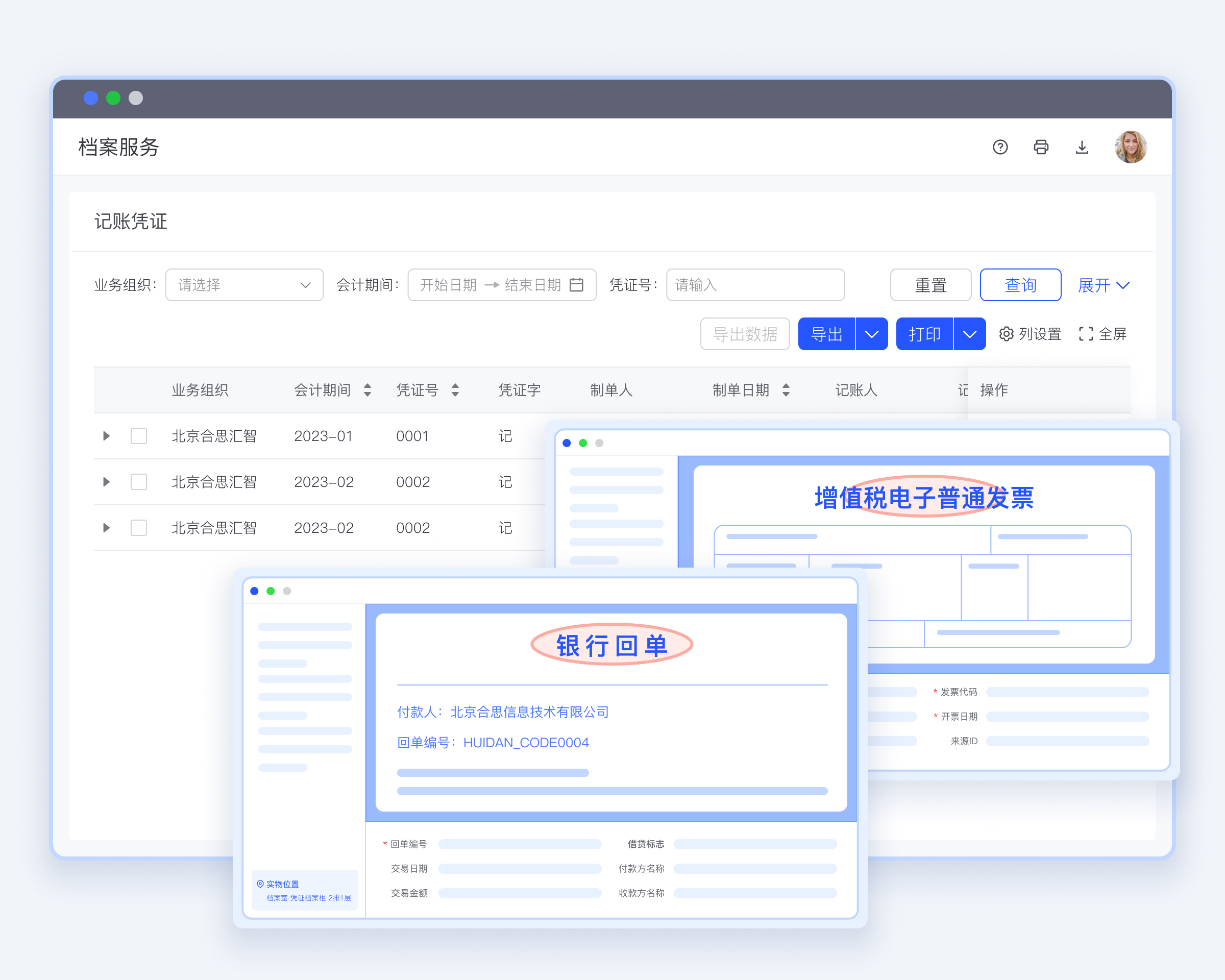 单一导出、成套档案导出、独立凭证合并导出等多种方式;电子档案在线单一打印,批量成套档案按序打印等,满足“纸电并存”下单套制运行快捷提供纸档的特殊场景。