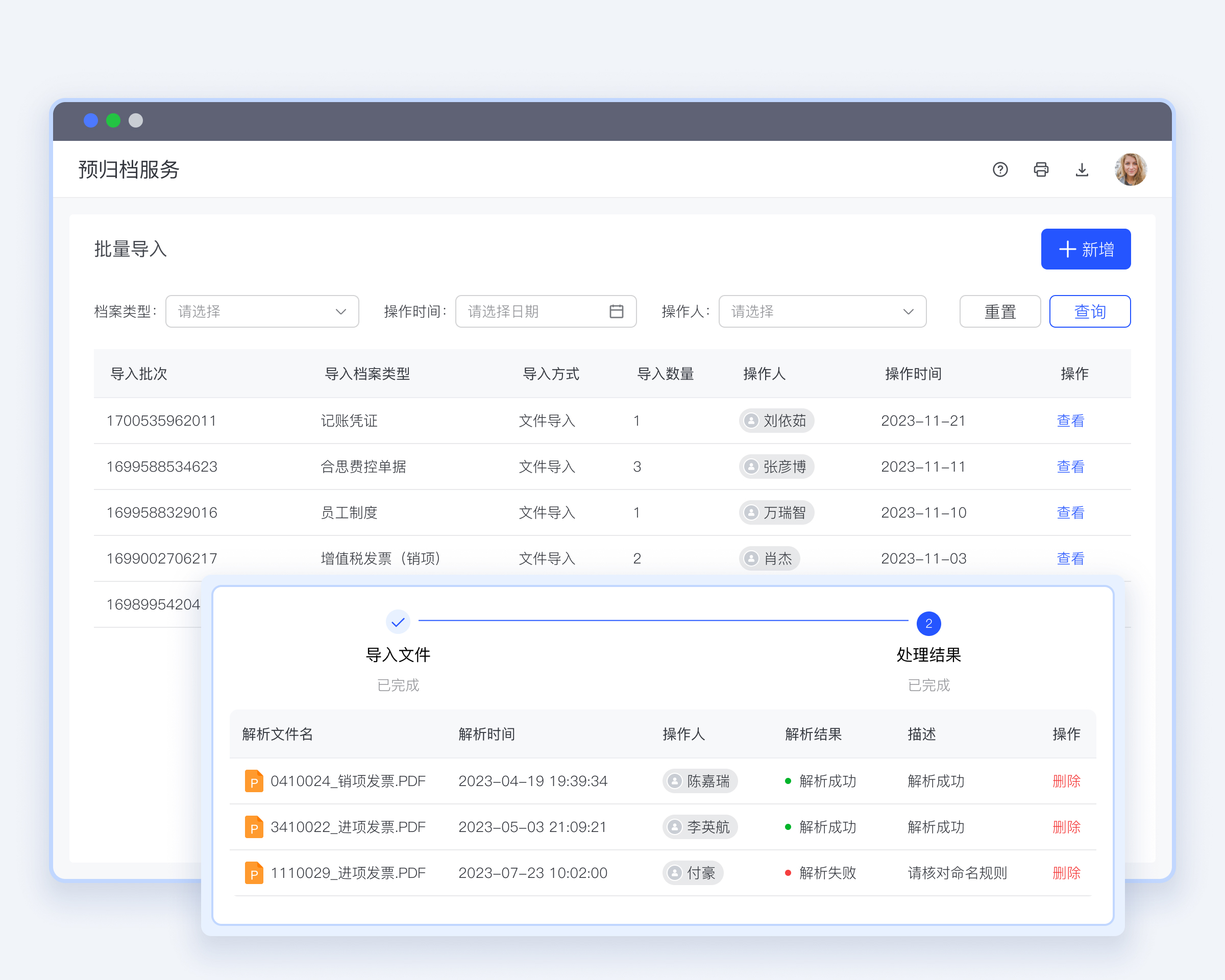 合思档案不满足系统集成要求的纸质文件、电子文件等零散会计资料,支持模板批量导入、外接设备导入等多种方式。