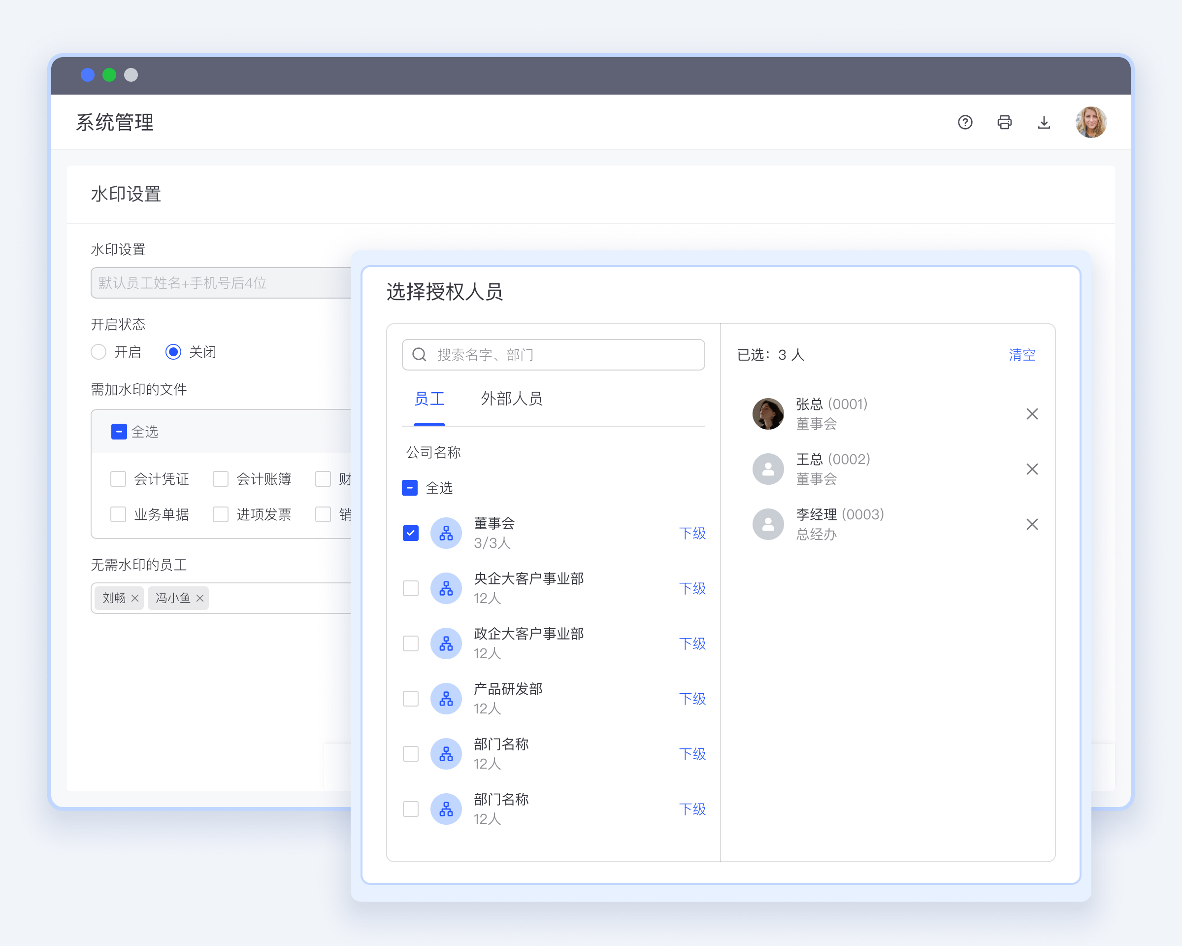 水印添加范围自定义设置,支持添加无需水印白名单员工。