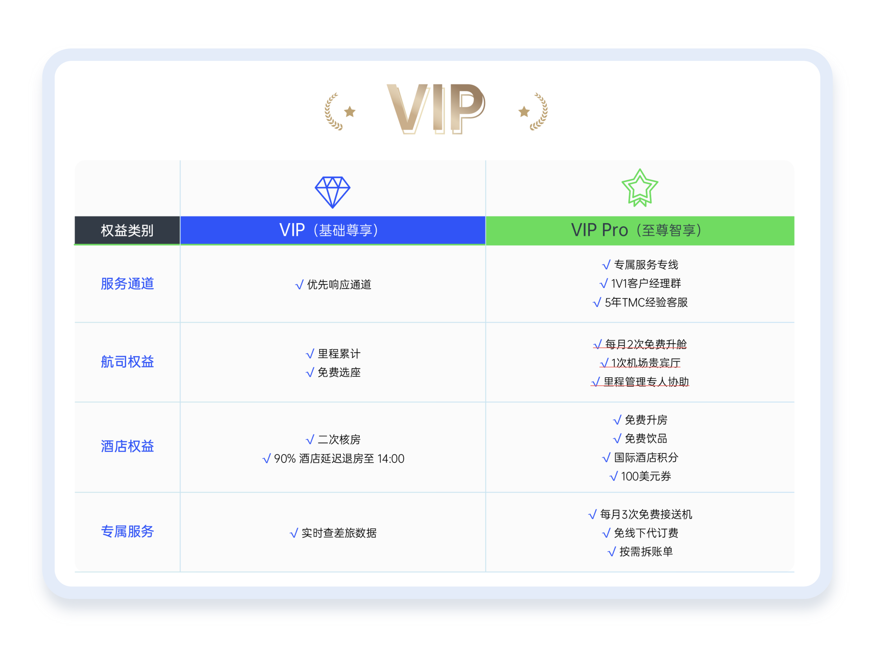 专属多线 + 5V1 深度管家,航司优先升舱、酒店免费房券等权益拉满,更含商务宴请代订、海外差旅定制等专属增值服务 —— 从行程细节到生活权益,每一处都贴合高端需求,让差旅不止是出行,更是专属定制的尊享体验。