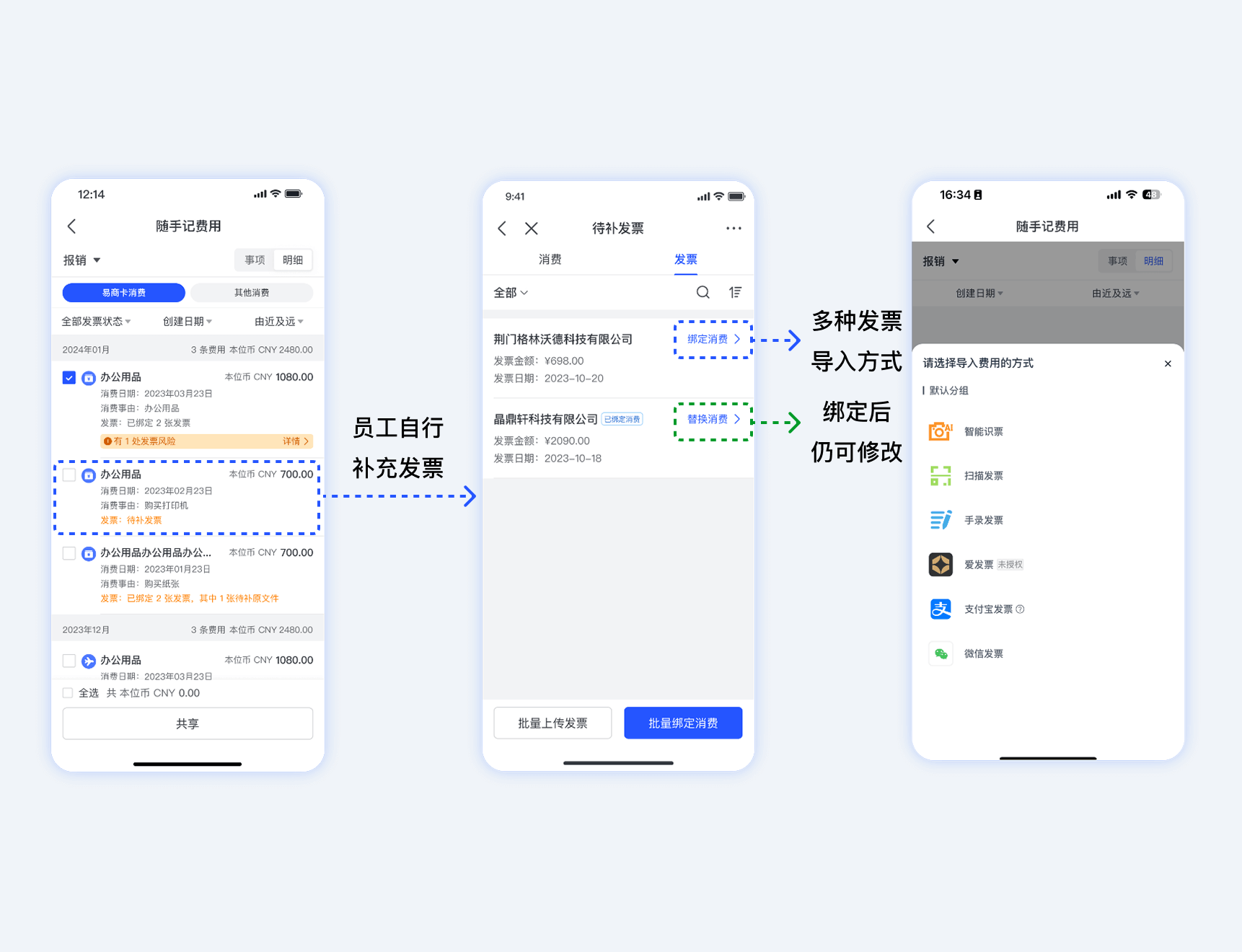 合思商旅平台事后发票自动采集并匹配,自动匹配未成功,员工可自行补充发票,支持多种发票导入方式、绑定后仍可修改