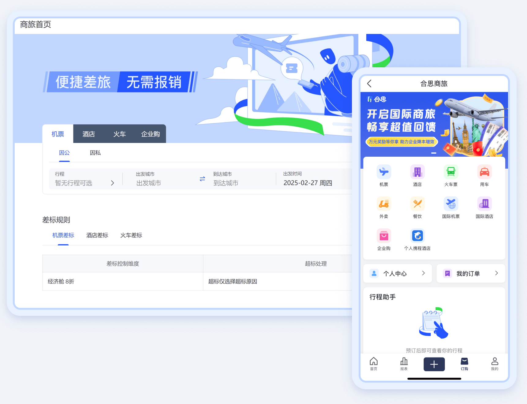 无缝对接12306,支持在线选座、占座、退票、改签。无需员工取票,票根统一邮寄。提供直达、中转快捷预定服务,支持企业+个人混合支付。