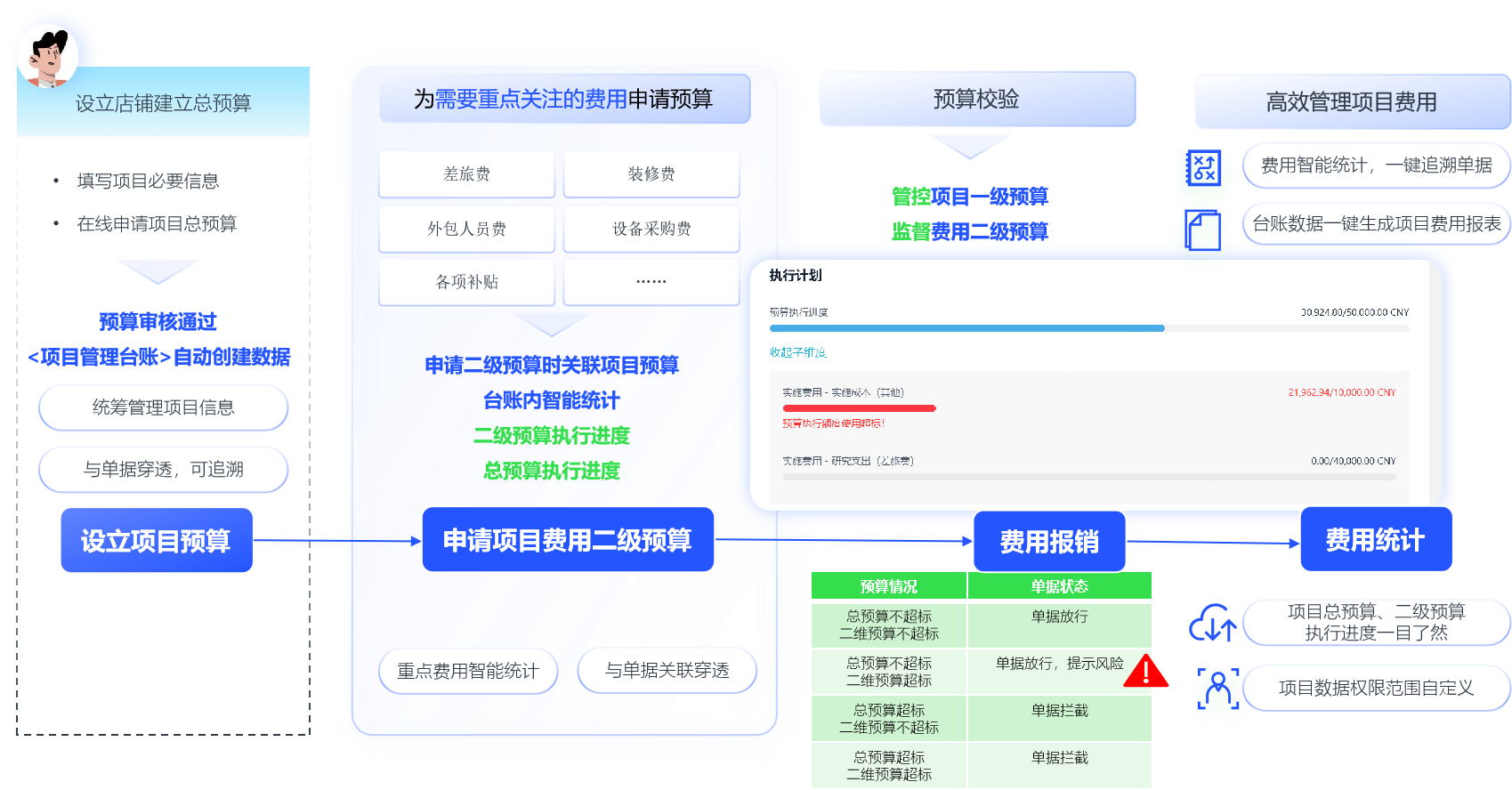 巡店督导经常连续出差,个人垫资高,但消费订购行为不透明,费用超标超越算情况时有发生,财务管控费用的压力大。